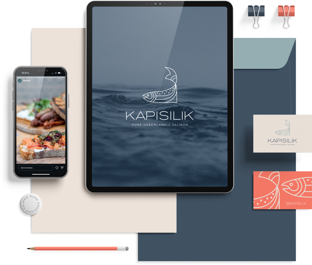 Farvepaletten tager udgangspunkt i dybe blå toner kombineret med en laksefarvet nuance, som refererer direkte til produktet og oprindelsen. Det skaber en stærk visuel kobling mellem brand og råvare, samtidig med at farverne tilfører varme og liv til det samlede udtryk.